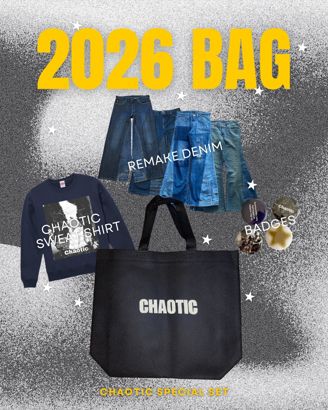 2026限定のChaotic特別セットをご用意しました✧ ★限定デザイン10.0oz クルーネックスウェット1着 ★限定デザイン缶バッチ4つ ★シルエット抜群のリメイクデニム1本 Chaoticロゴの不織布バッグに入れてお届けいたします✴︎ 近くへのちょっとしたお買い物などでお使いいただけるようなトートバッグです! リメイクデニムは以下2種のデザインをお選びいただけます! ・インサイド(内側にデニムをドッキングした、ワイドストレートなシルエット) ・ワイドフレア(Chaoticで大人気の定番シルエット) ※お色味はランダムです ※サイズは下記のサイズ範囲になります。 スウェットはデニムとの相性を考えた ダークネイビーのクールなデザインに仕上げました。 ※厚すぎず薄すぎず、ちょうど良い10oz。秋~春まで長い間着ていただけます。 裏地は、汗をかいた時もベタつかない吸水性の高いパイル地使用。 着用感は是非当店Instagramのリールをご覧ください。 ○サイズ <クルーネックスウェット> S 肩幅44cm 身幅52cm 袖丈57cm 着丈63cm L 肩幅52cm 身幅58cm 袖丈60cm 着丈71cm XL 肩幅55cm 身幅63cm 袖丈61cm 着丈76cm ※綿 100% 裏パイル <リメイクデニム> ・インサイド ヒップ55~61cm ウエスト44cm 股上26~33cm 股下72~80cm 総丈102~104cm 渡り幅30~37cm 裾幅32~38cm ・フレア ヒップ50~52cm ウエスト37.5~40cm 股上24cm 股下74~79cm 総丈99~101cm 渡り幅28cm 裾幅30~35cm ※ご用意しているデニムパンツのサイズ範囲です。 平置き実寸。 ※上記の採寸をご自身のものと照らし合わせの上ご検討ください。 ※model:171cm ○状態 <スウェット・缶バッチ> NEW <リメイクデニム> USED ○配送 10日程度で発送いたします。 *一点物であり、他の販路でも販売しておりますので無くなり次第終了となります。