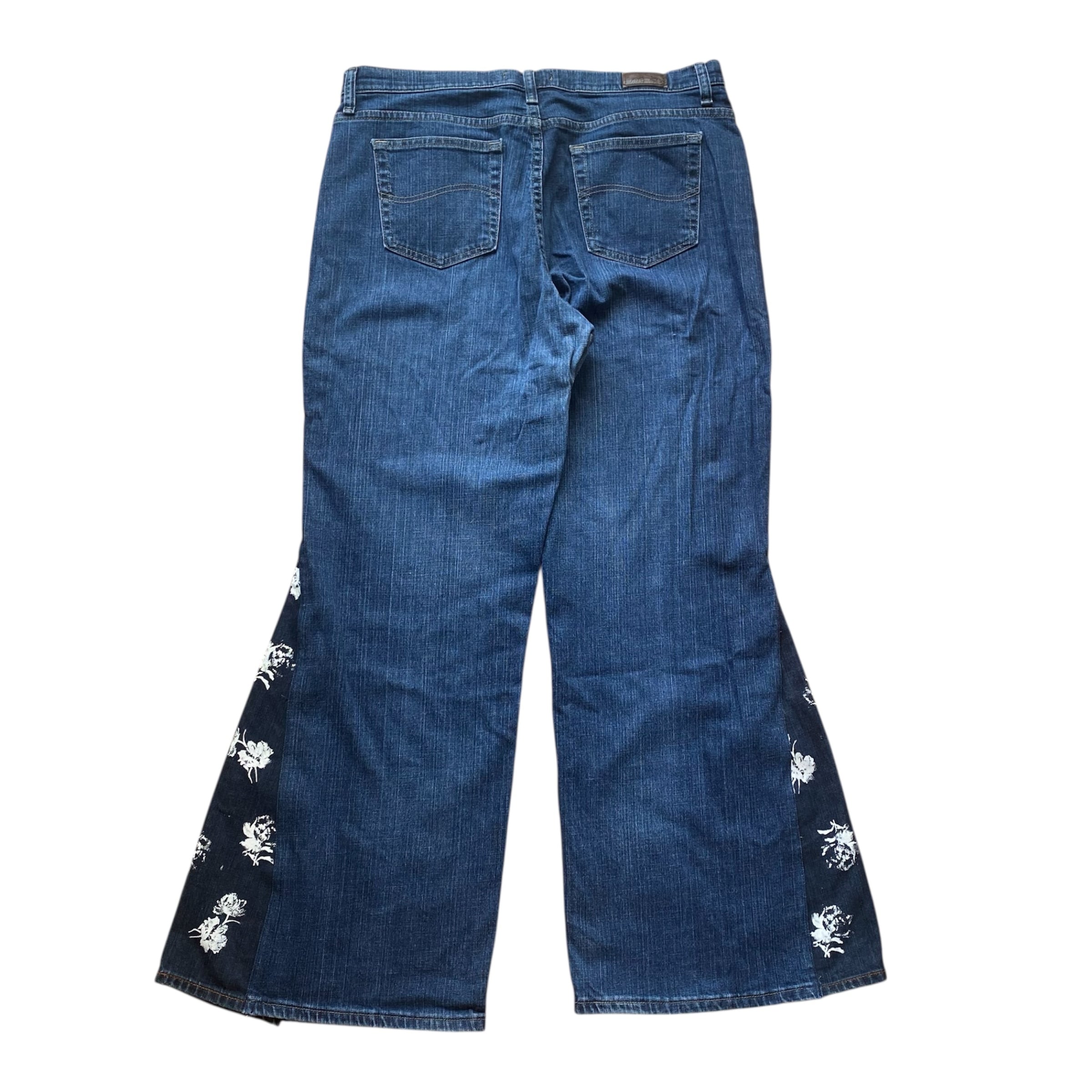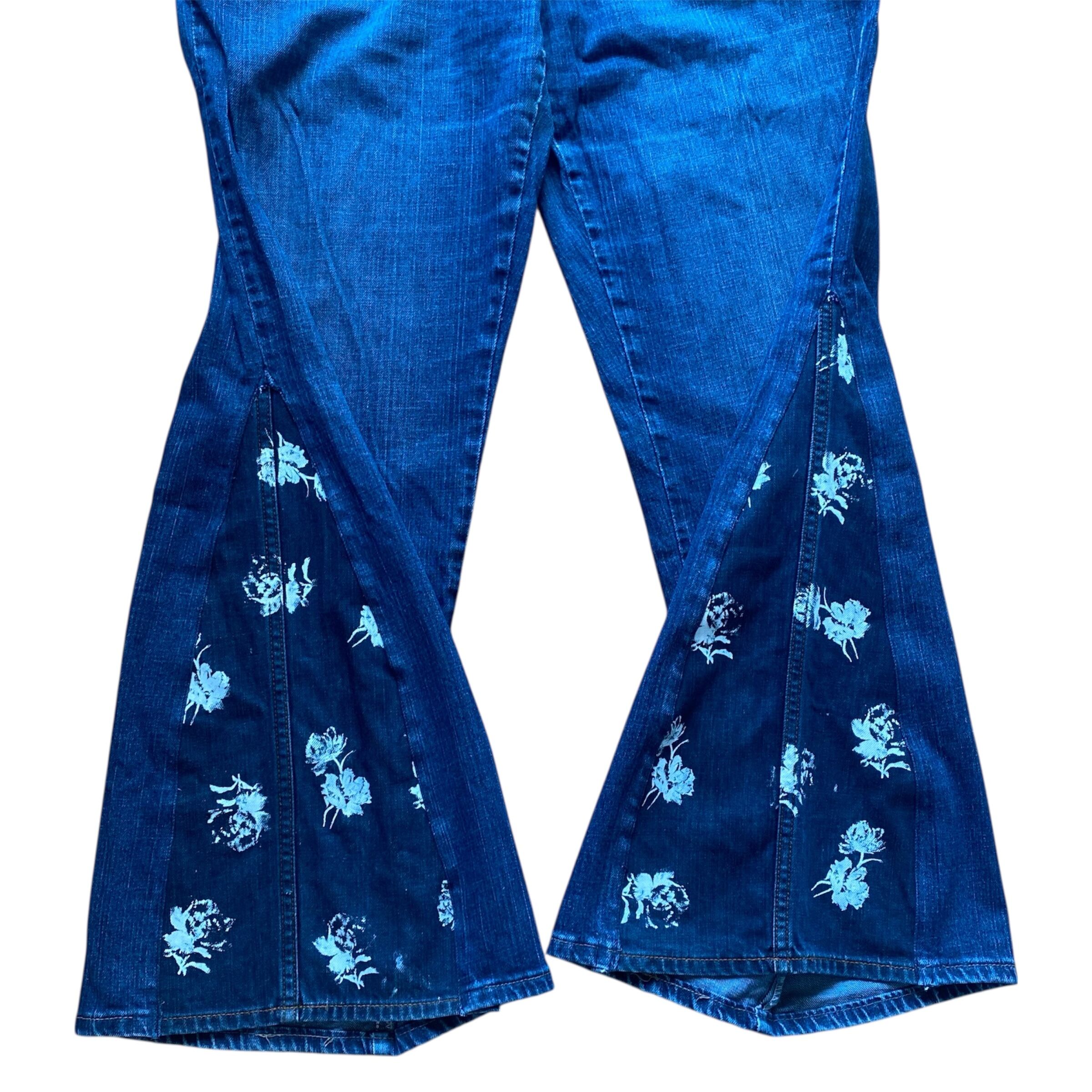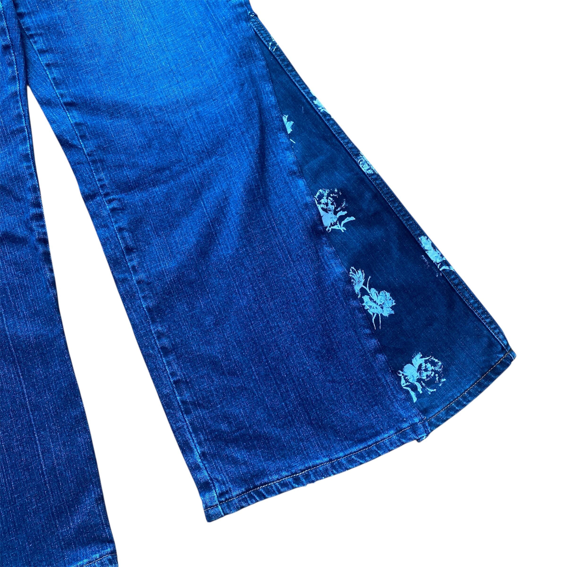 USEDデニムを使用、オリジナルでプリントした花柄を構築し、大きめサイズのフレアデニムを制作しました。