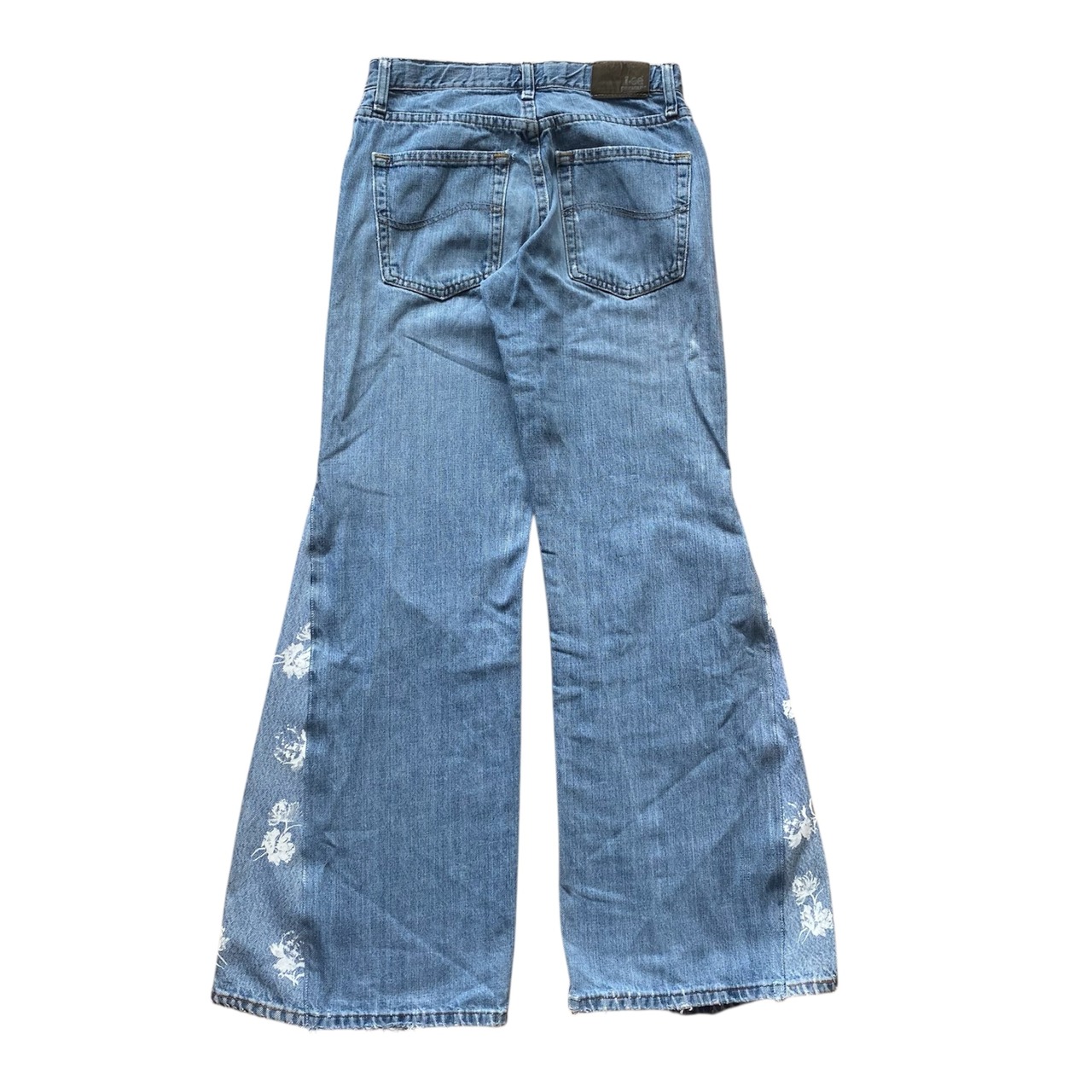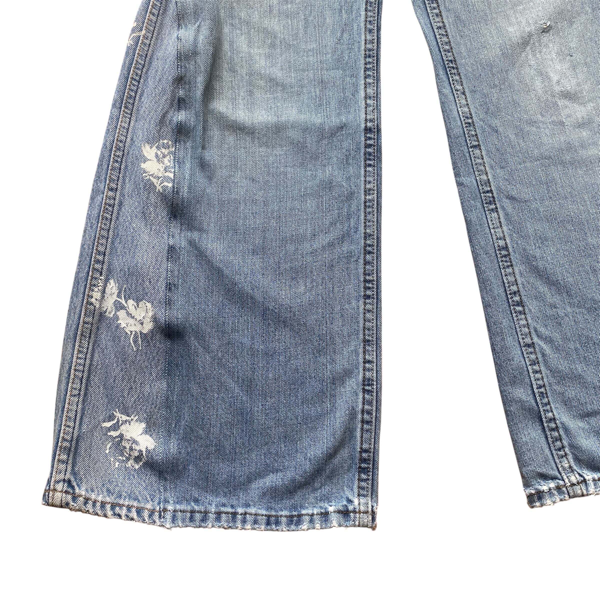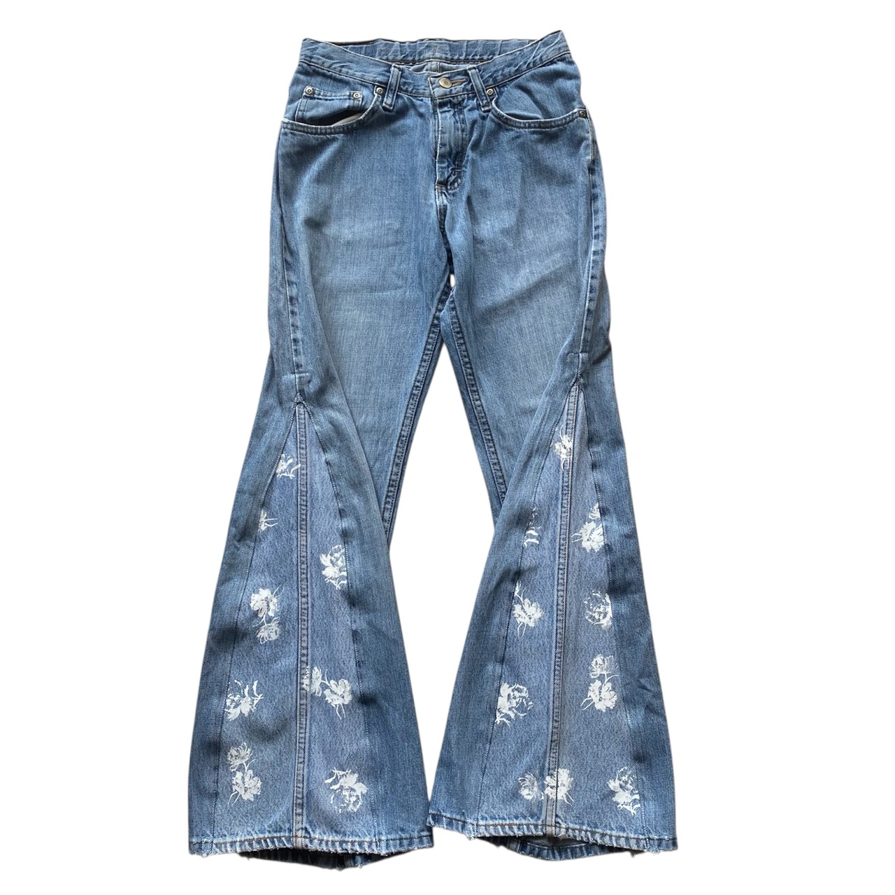 USEDデニムを使用、オリジナルでプリントした花柄を構築し、レディースサイズのフレアデニムを制作しました。