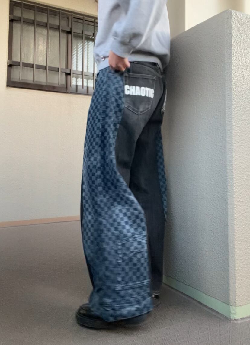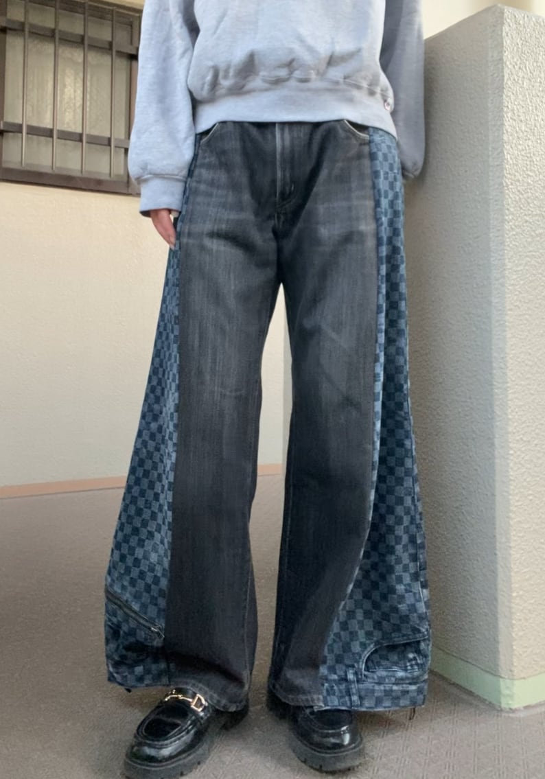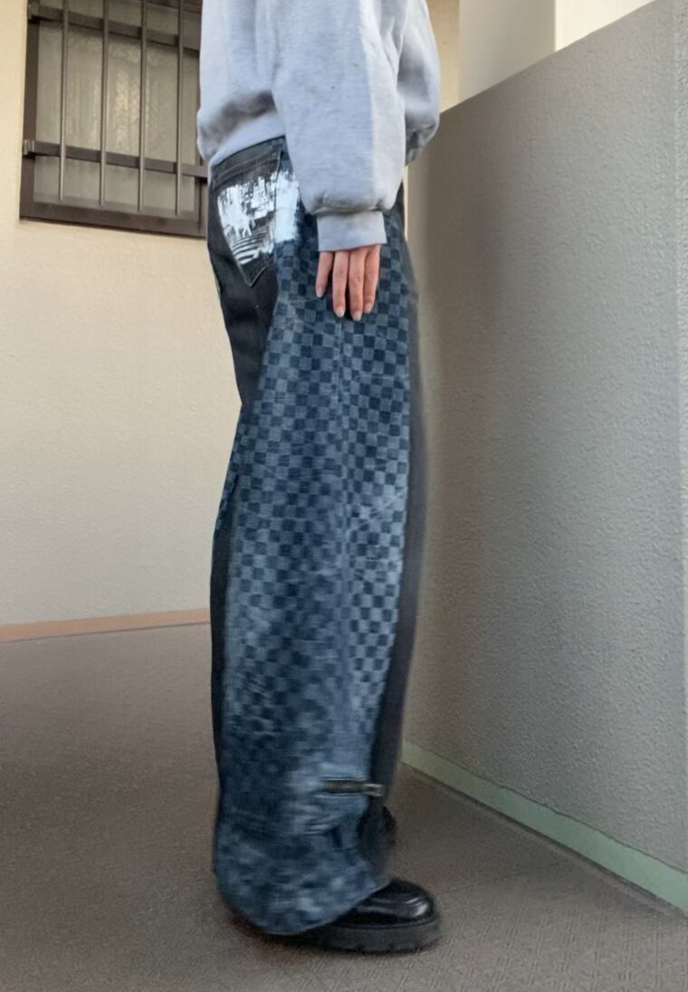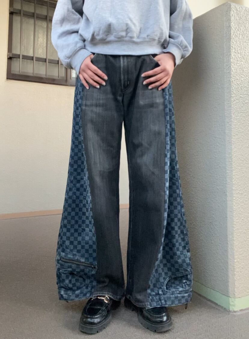 珍しいチェッカー柄デニムと合わせた一点物のリメイクデニム。