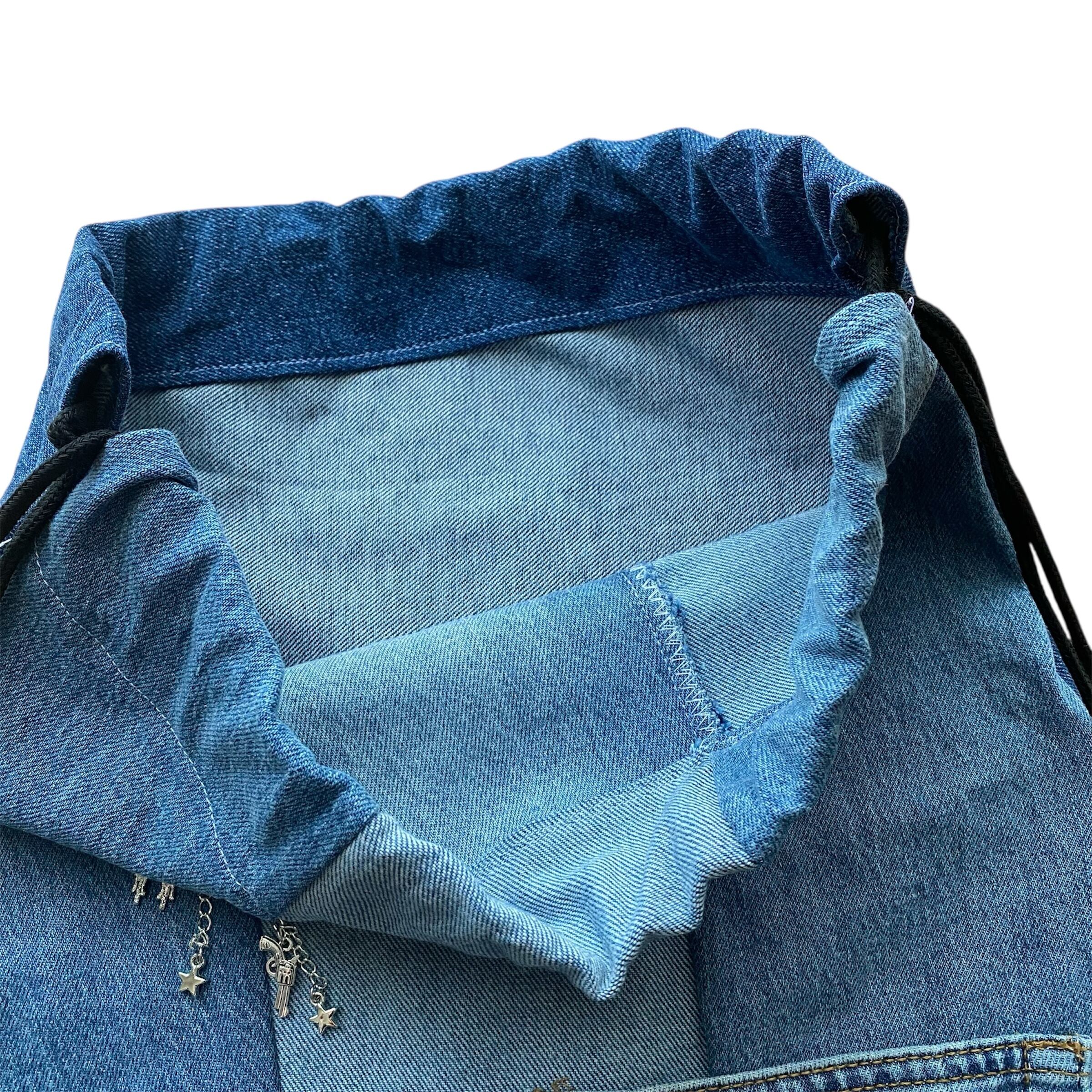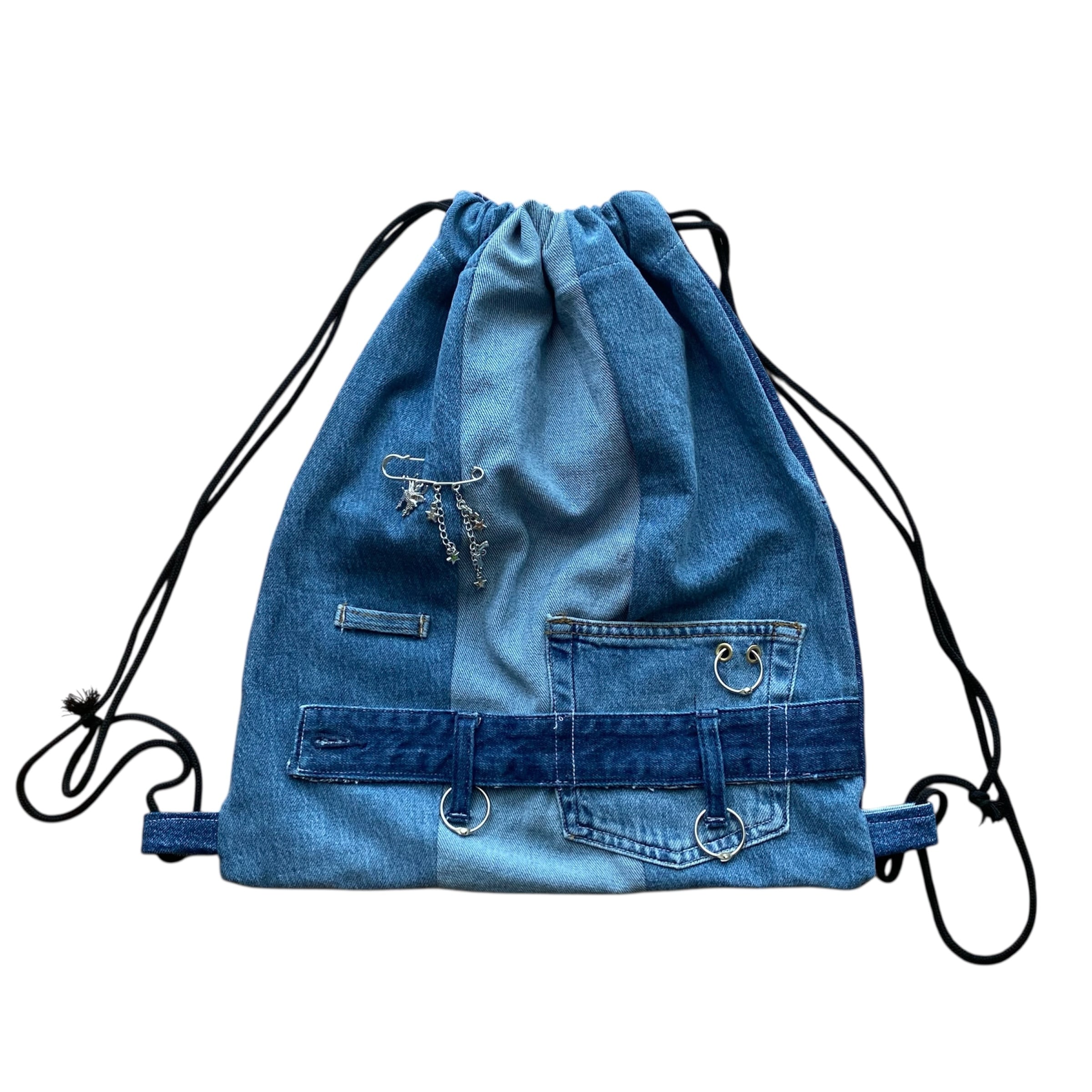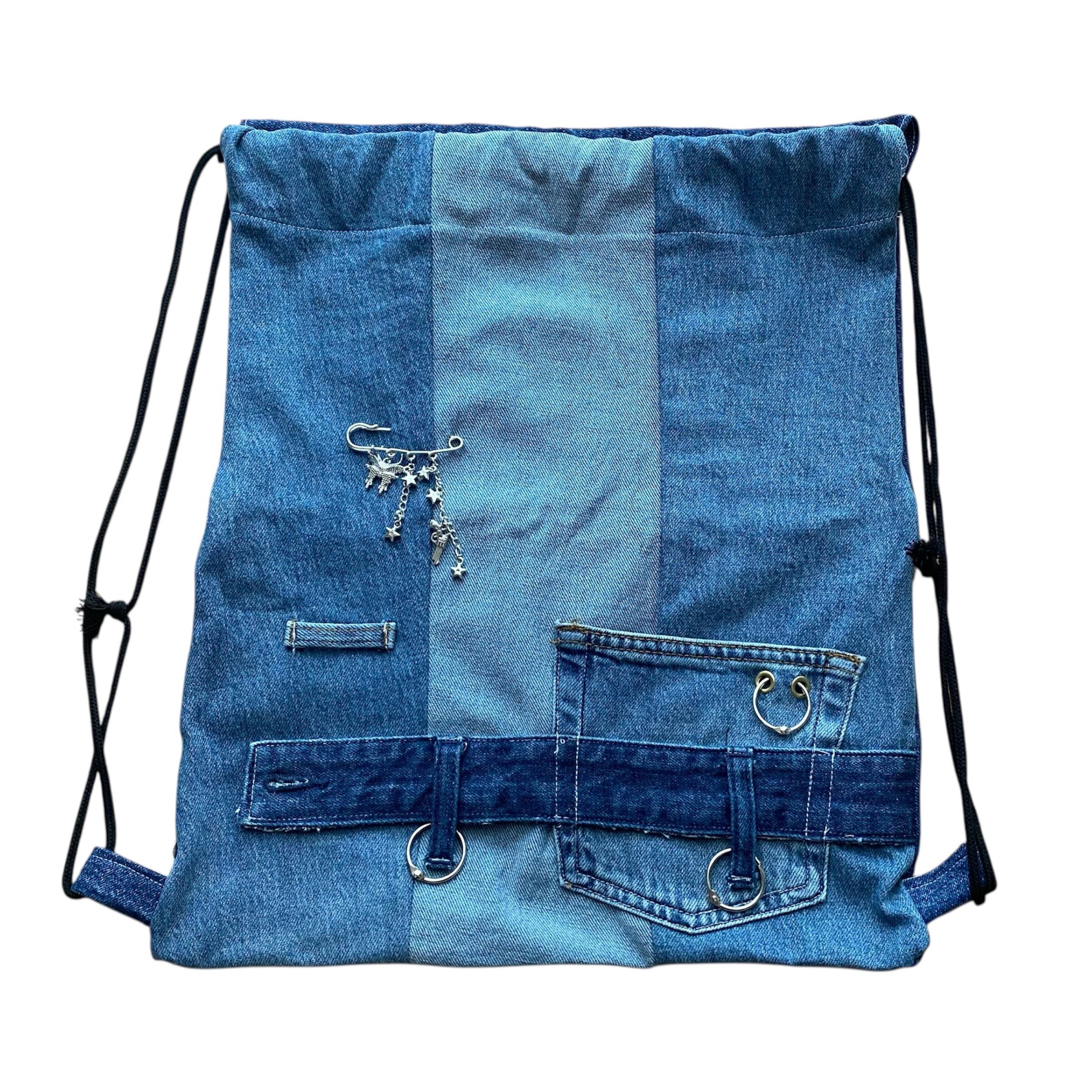 USEDデニムを使用した再構築ナップザックです。デニムとの相性抜群な特製チャーム付き✶