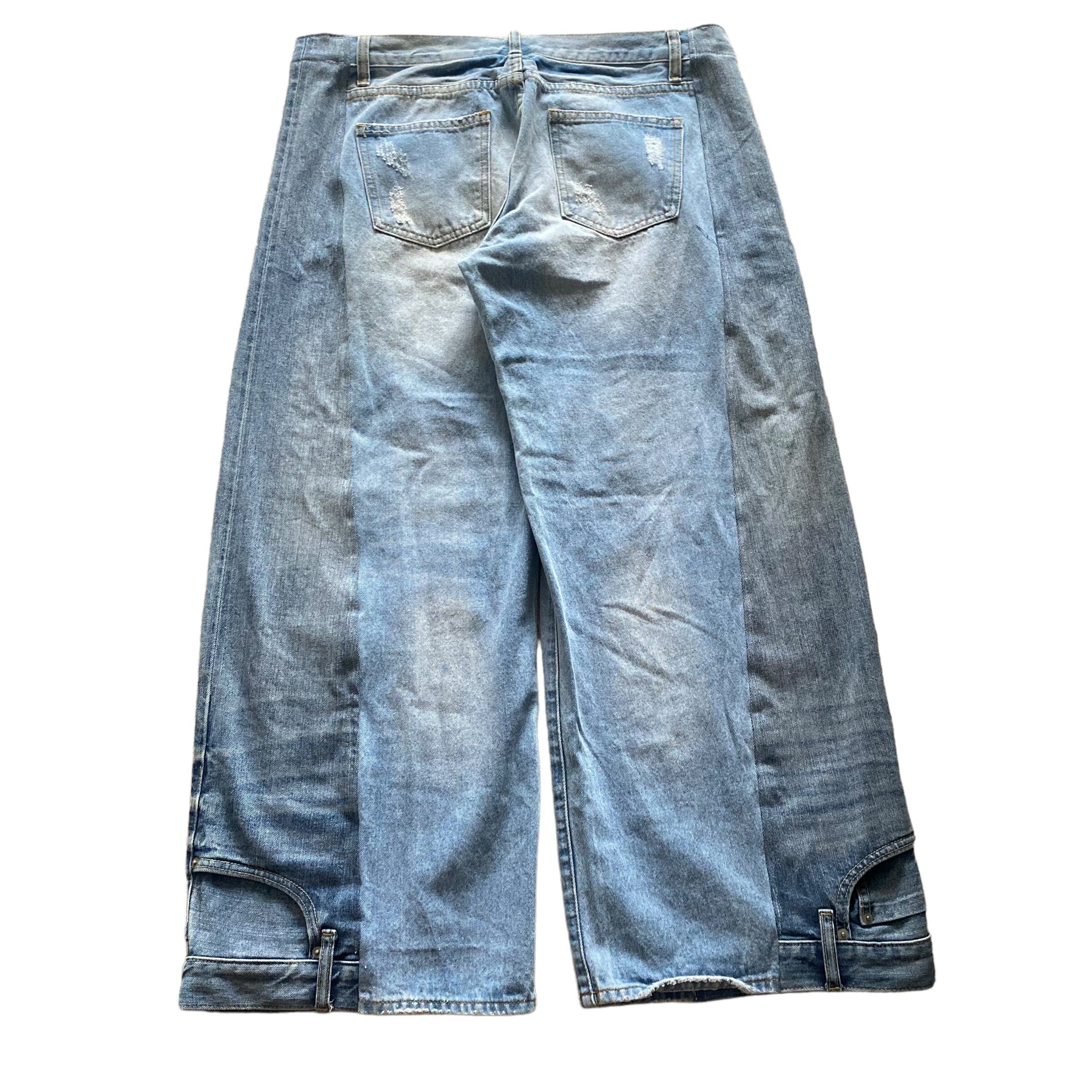 同カラーのデニム2本をドッキング。ワイドシルエットでウエストは大き目。