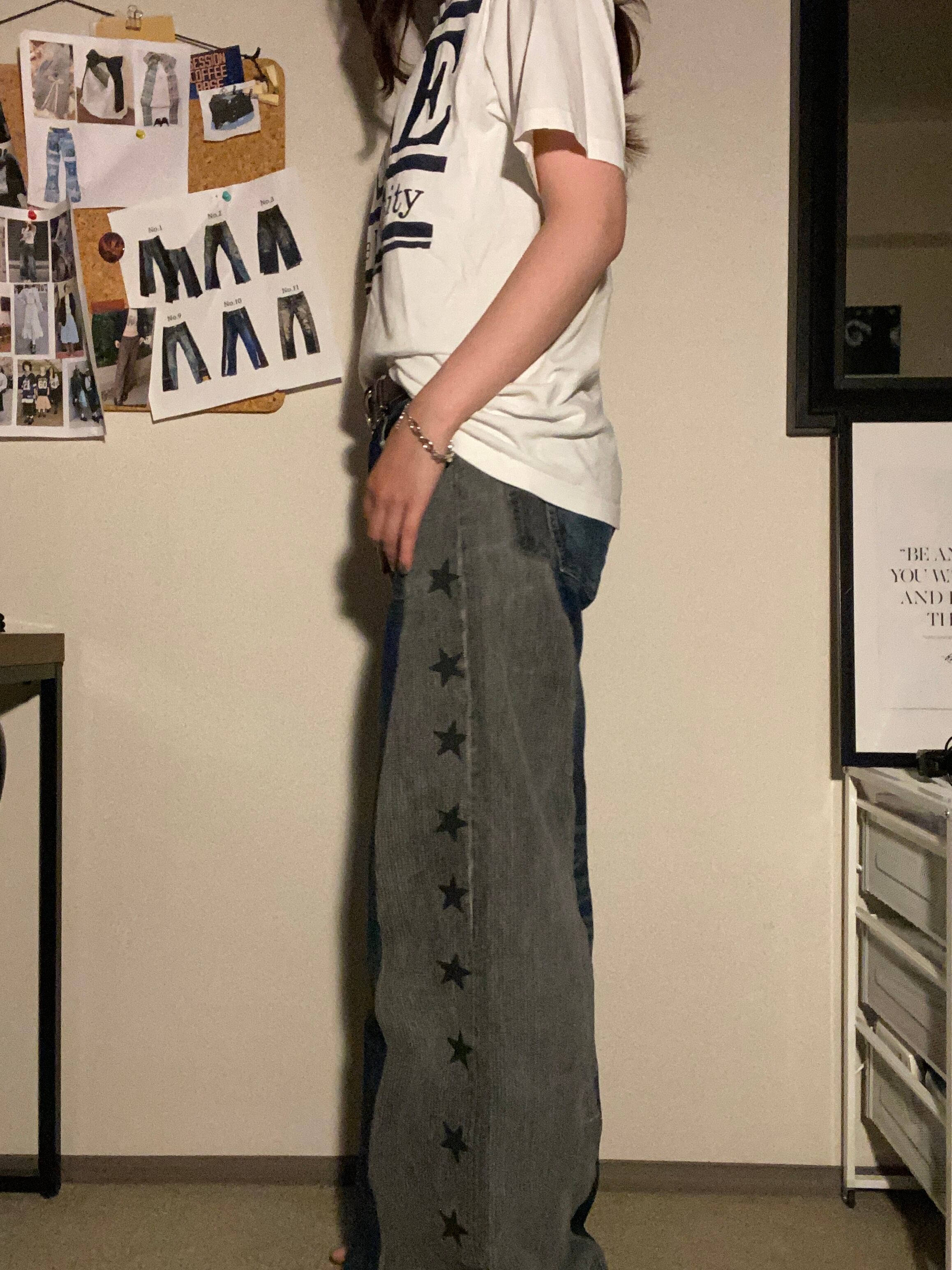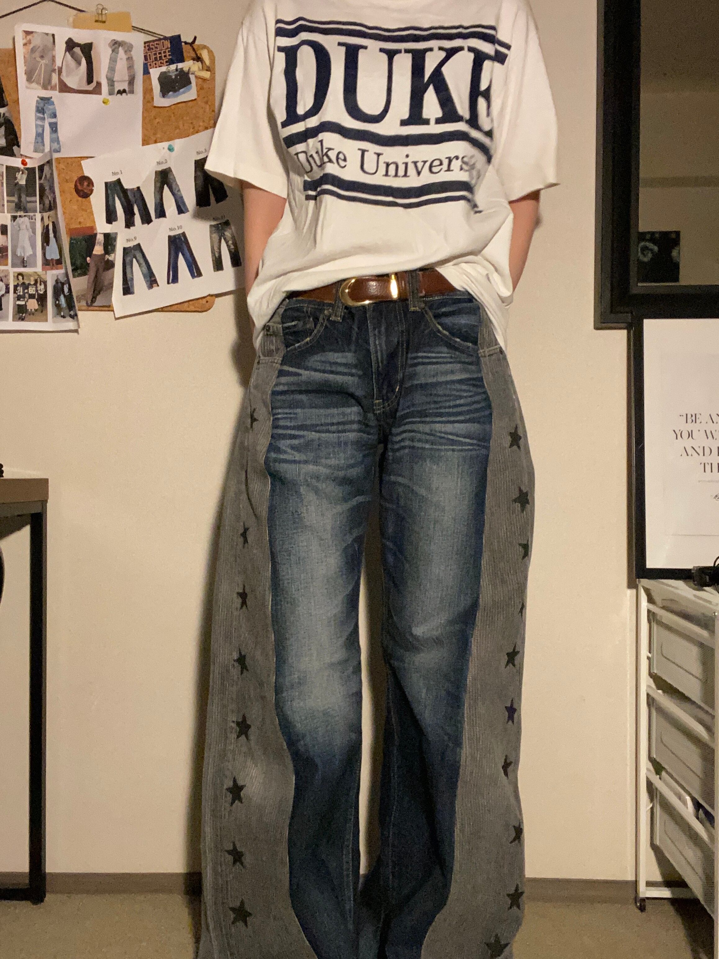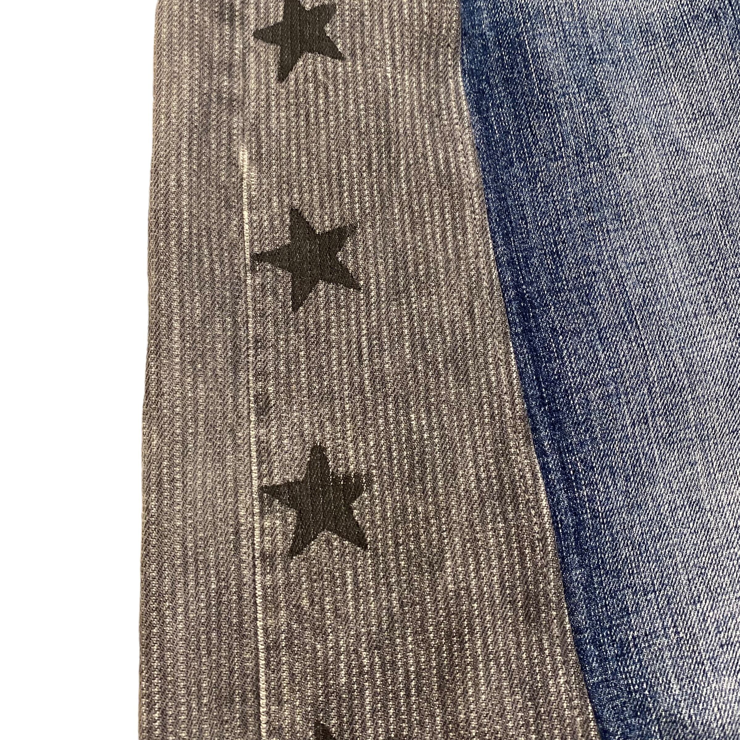 星柄 再構築デニム 変形デニム 色落ちデニム ダメージ加工 ユニセックス アメカジ パンク ロック ヒッピー デザインデニム デストロイ Y2K 個性的 一点物 カスタムボトム 海外ファッション リビルド 切り替えし 平成 韓国 原宿ファッション モードファッション ストリートファッション スケーター シティーボーイ 古着男子 古着女子 古着ファッション ジーンズ メンズ レディース 80年代 90年代