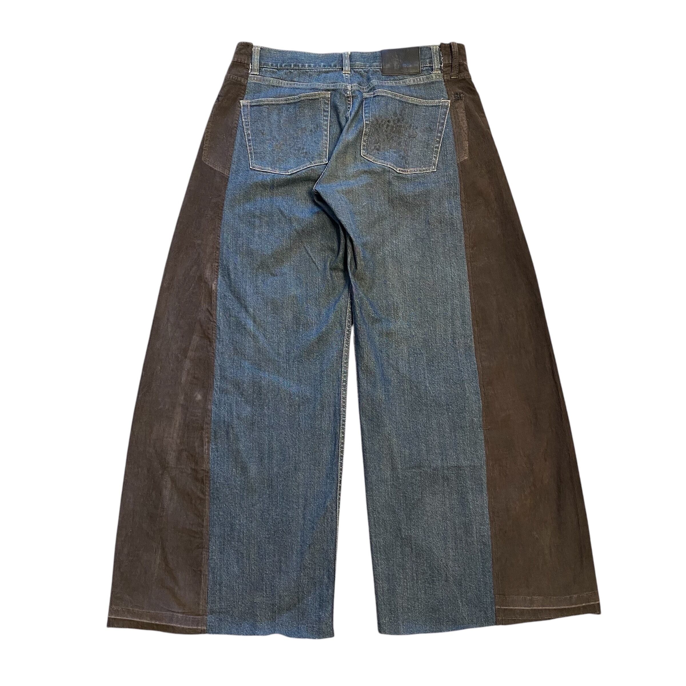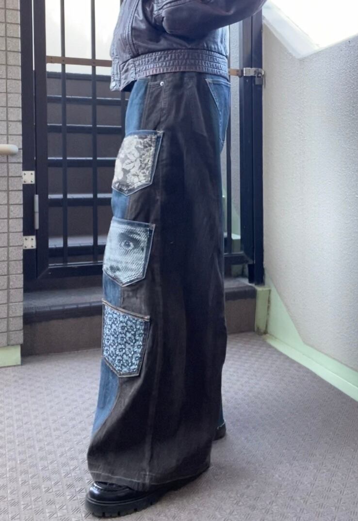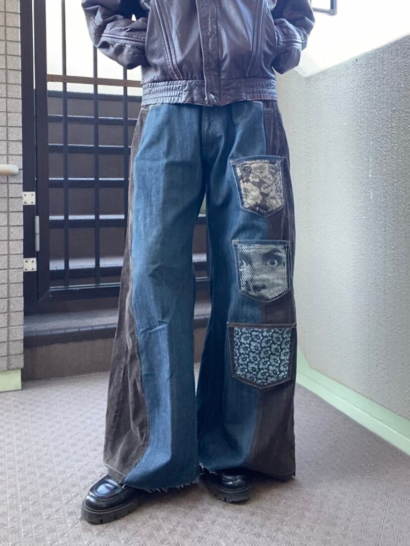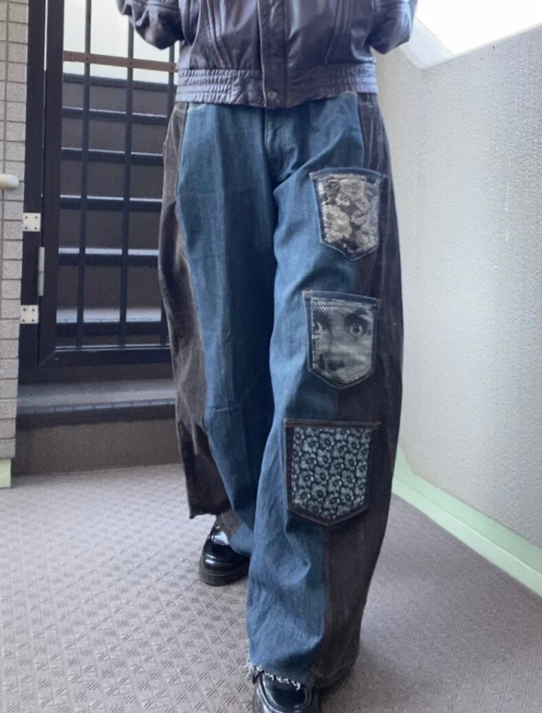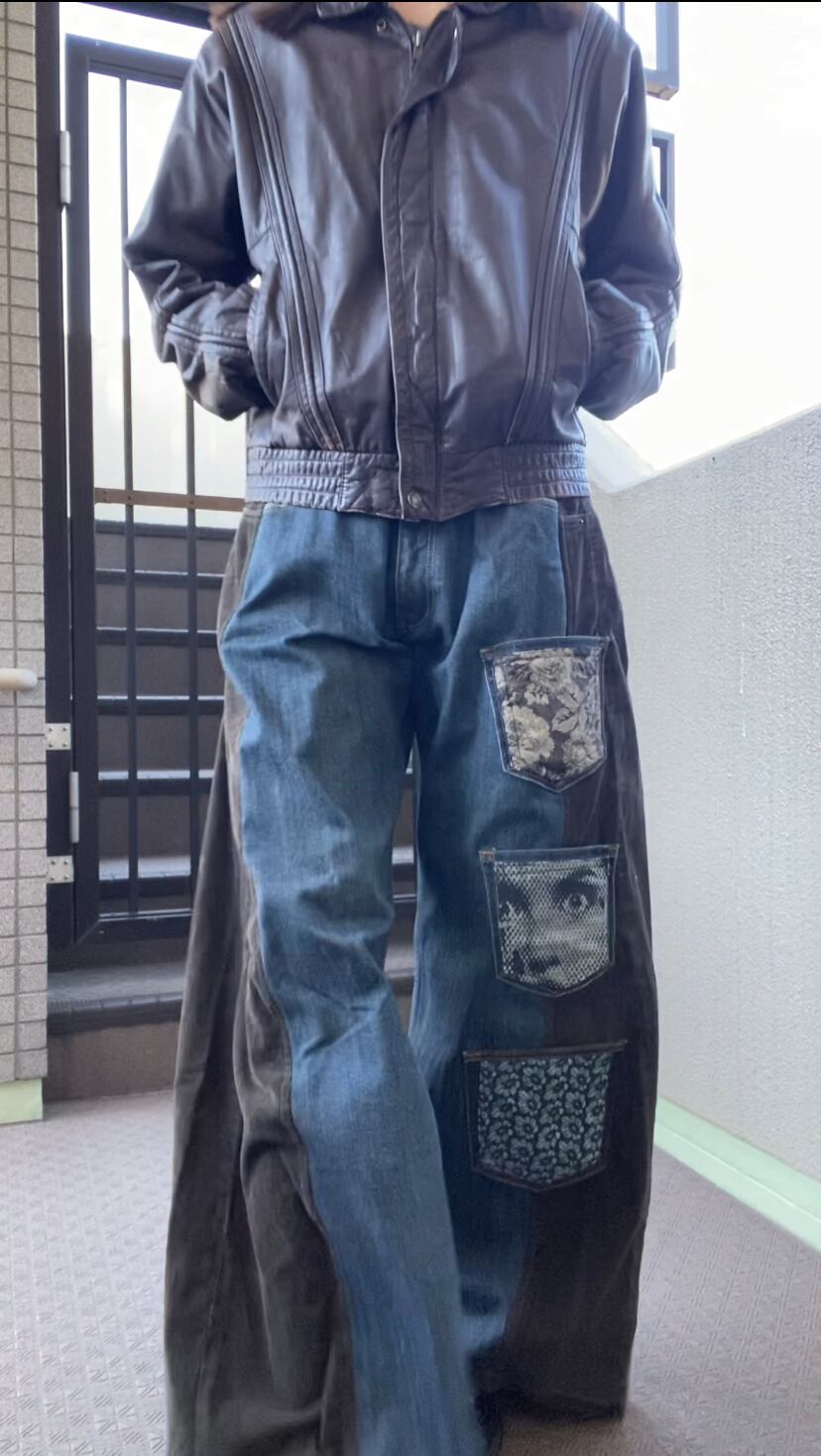 コーデュロイパンツとデニムをドッキングし、ワイドバギーなシルエットに再構築しました。シルクプリントしたデニム生地や着物生地を施したポケットをつけて個性的に。