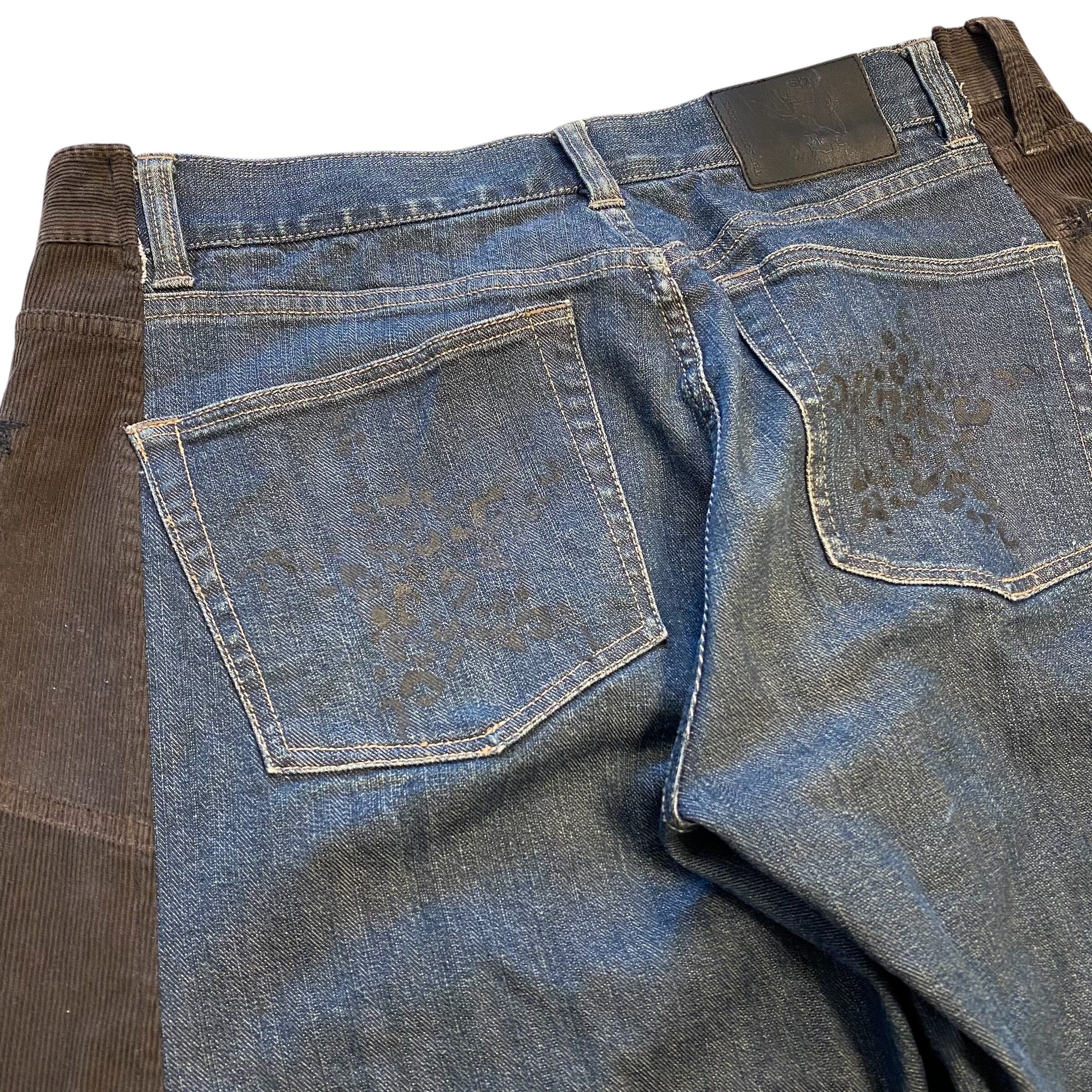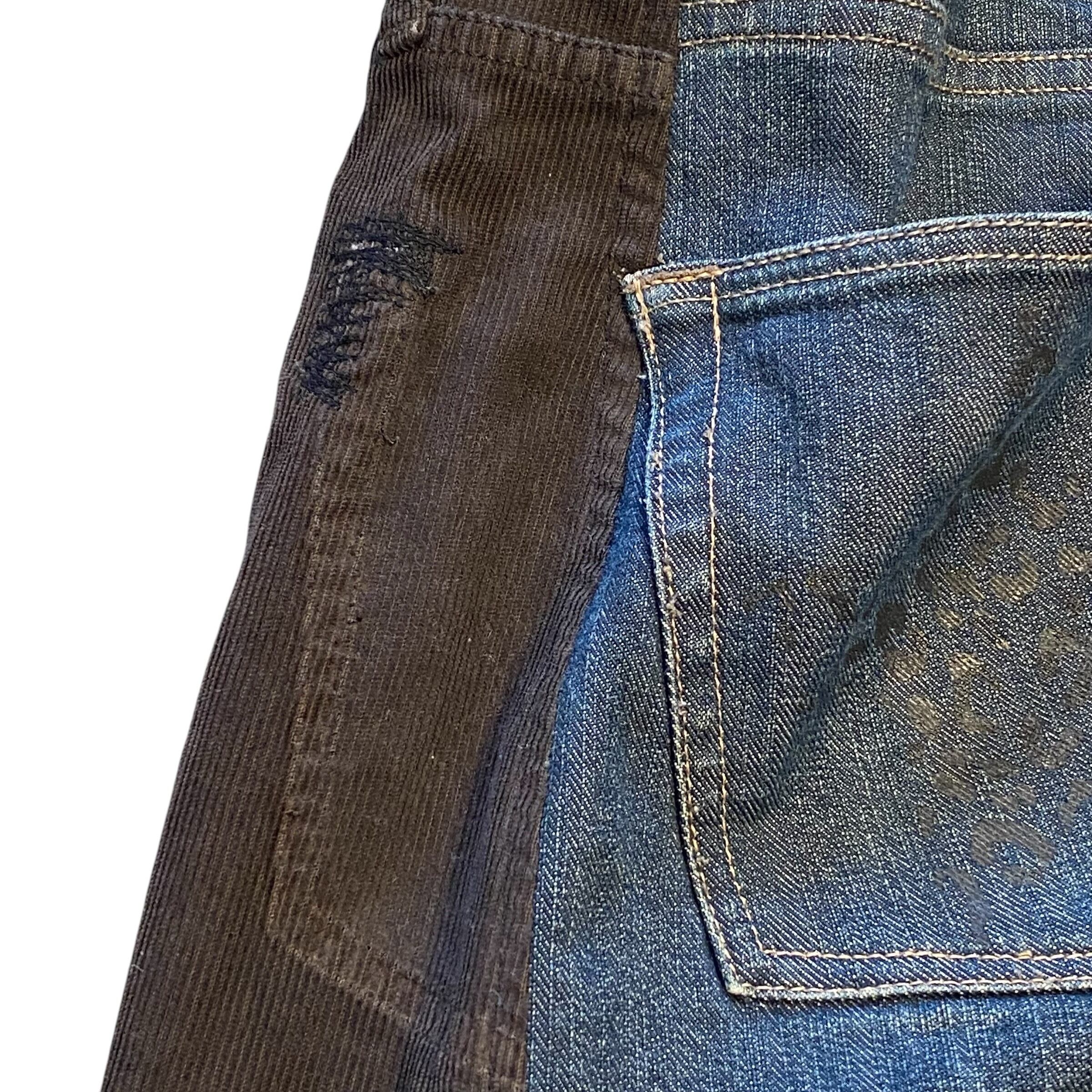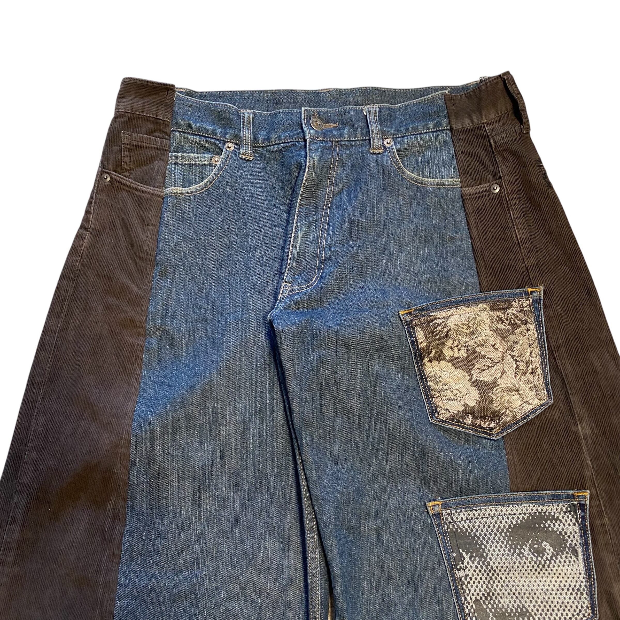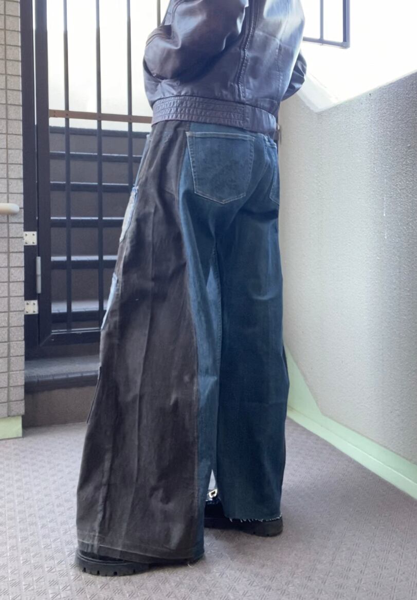 コーデュロイパンツとデニムをドッキングし、ワイドバギーなシルエットに再構築しました。シルクプリントしたデニム生地や着物生地を施したポケットをつけて個性的に。